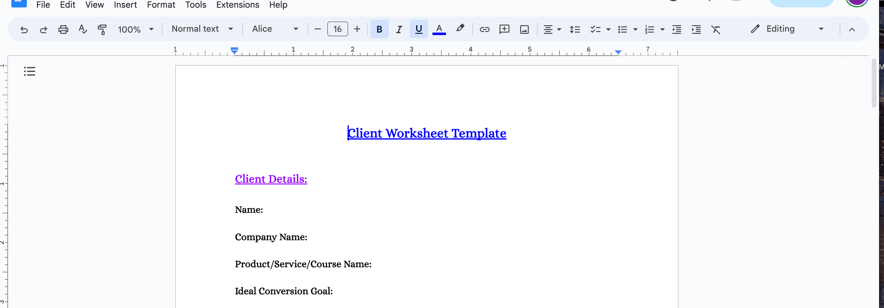 Great job!  The next section of onboarding is pre-filling your Google Doc with what you know, ahead of your long discovery session with your Perfect Webinar Expert.