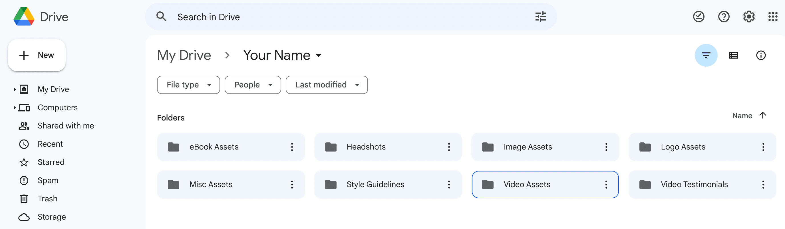 Let's set ourselves up for success by taking the time to organize all of the tools that will be at the design team's disposal.  This is where you'll upload all of the resources and assets you currently have.  Don't worry if your Google Drive folder looks different than the one above... yours will have folders that are specific to your project.