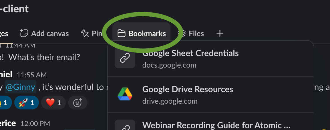 You'll see your Google Sheet in the "Bookmarks" tab, which is pinned to the top of your channel.  You'll always be able to find this Google Sheet here in your Slack channel.