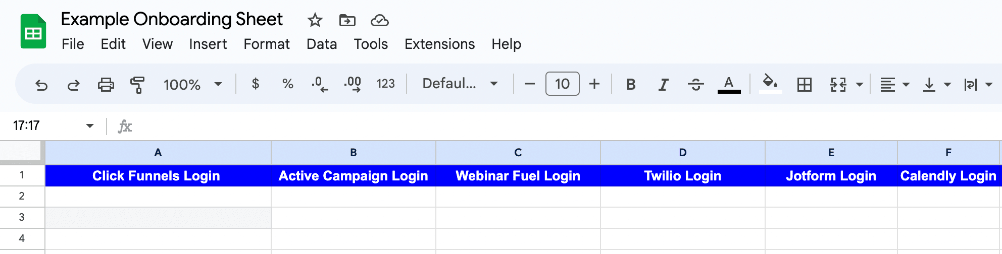 This is where you'll upload all of the login credentials we'll need to complete the job.  Don't worry if your Google Sheet looks different than the one above... yours will have credentials that are specific to your project.